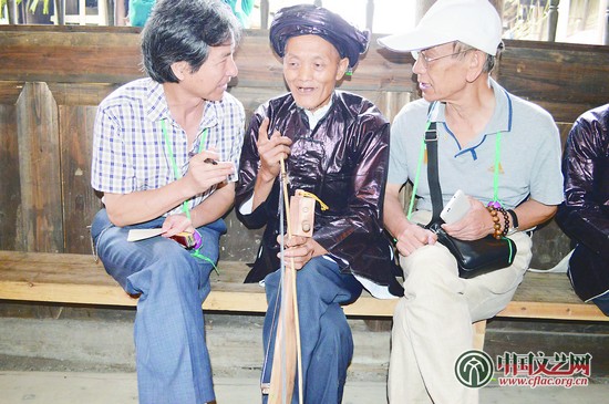 采风团在榕江县宰荡侗寨和当地的民间艺人交流