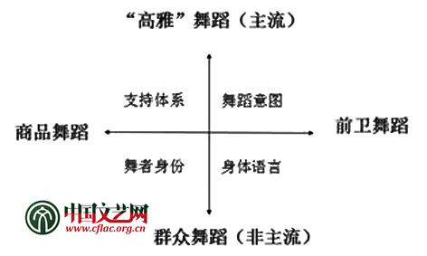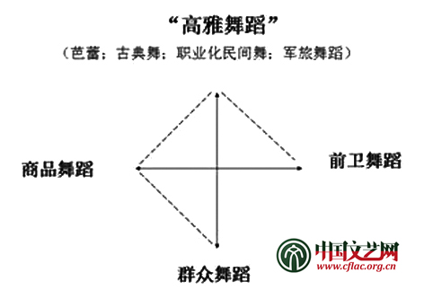 按照当年汉唐气象,中国古典舞完全可以放在全球坐标与多元方法论中审视。今天,世界的舞蹈形态大致成一个坐标轴或“十字架”形。坐标轴上方是高雅舞蹈,是主流的古典舞;下方是群众舞蹈,是非主流的民间舞(包括乡村的和城市的);坐标轴右侧是前卫舞蹈,现当代舞蹈归于此;左侧是商品舞蹈,用于盈利。四类舞蹈各有其支持体系、舞蹈意图、舞者身份以及身体语言表达。(如图一)