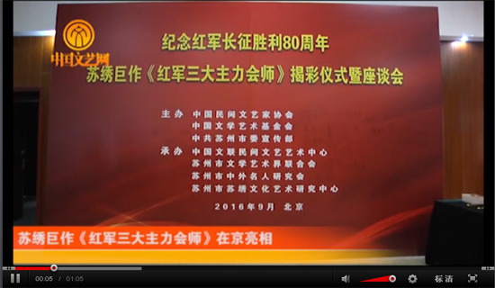 为纪念红军长征胜利80周年,中国民协、中国文学艺术基金会、苏州市委宣传部等9月29日在北京共同举办苏绣巨作《红军三大主力会师》揭彩仪式暨座谈会。作品以苏绣丝线特有的质感风格再现了波澜壮阔的中国革命历史画卷,表达了对革命前辈的深情缅怀。中国文联党组书记、副主席赵实与苏绣艺术家卢招娣共同为这一苏绣巨作揭彩。