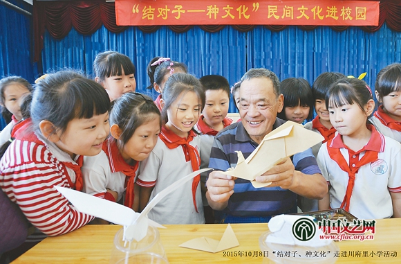 2015年10月,“结对子、种文化”天津民协走进南开区川府里小学活动,艺术家辅导孩子们做手工