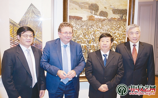 中国驻比利时大使曲星(右一)、比利时布鲁塞尔大区首席大臣韦尔沃特(左二)、中国美协主席刘大为(右二)、中国美协驻会副主席徐里(左一)在作品前合影
