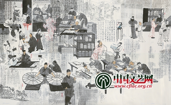 与以往历史画创作技法、材质多出于中国工笔画、油画和单体雕塑不同,此次历史画创作的画种扩充了版画和多人物组雕、浮雕、类装置形式。这是因为版画作为重要的美术形式之一,近年来在国内诸多主题性大型美术创作活动中彰显了丰富的表现力和承载可塑性。版画家通过多版拼接、母版展示等手法,大大增强了版画艺术的视觉效应和形式张力。此次历史画创作有17位著名版画家担纲作品创作,他们充分挖掘材质潜力和技术语言特色,取得了超乎预期的效果。如邬继德的《雕版印刷》、代大权的《唐宋八大家》、戚序等人的《中华营造法式》以及赵宗藻、蔡峰等作者的《中国传统四大节日》等作品。而通常以历史人物肖像为主的雕塑,此次也推出了除人物圆雕以外的组合性群雕、浮雕形式的作品,以多人物组合到情景组合、具装饰意味的壁雕等,增强了人物和由人物展开的历史事件的丰富性。在风格多样的国画、油画作品中,作者们更是力求在画面结构新颖独特基础上吸收更多不同的形式语言和表现技巧,除糅进了前述自古典主义以降至现代主义、后现代主义诸种流派手法的同时,还融入了风俗画、壁画和装饰绘画的多重元素,为的是极尽所能,使作品得以最完美的呈现。