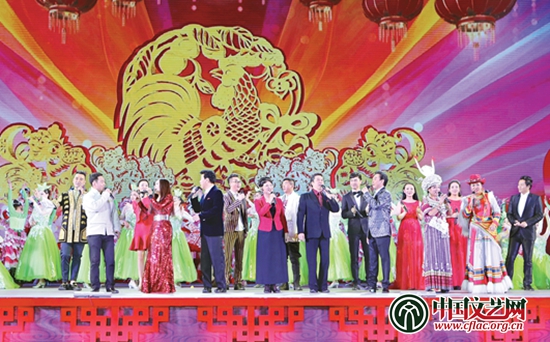 百花迎春辞旧岁,雄鸡高唱贺新年。1月7日下午,北京人民大会堂宴会厅里张灯结彩、笑语欢歌、春意盎然,来自各艺术门类的老中青几代艺术家2000余人欢聚一堂,共襄“百花迎春——中国文学艺术界2017春节大联欢”。这是中国文联第十次全国代表大会、中国作协第九次全国代表大会闭幕后不久举办的一次文艺界大聚会,集中展现了近年来文艺界深入学习贯彻习近平总书记在文艺工作座谈会和中国文联十大、中国作协九大开幕式上的重要讲话精神,坚持以人民为中心的创作导向,深入生活、扎根人民,创作优秀作品,服务基层群众,繁荣发展社会主义文艺的丰硕成果和昂扬向上的精神风貌。