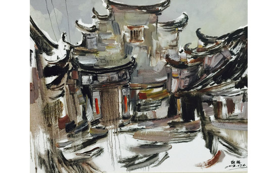 谢麟油画的题材当然不仅仅限定在广西和广西少数民族的题材,他还有许多在他的生活的“远方”的题材,比如西北高原、福建山区风光、江南水乡等等。他处理各种不同的题材时,首先正确地解决了地方物象与地方色彩的关系,同时把这种关系深度化,正确地体现出主观与客观的互参互渗互在。比如在处理西北题材时,对黄红二色的调和构成创作的深刻意蕴(如《杨家沟》等),黄色调具有客观性、写实性,而红色调则是主观的和写意的。白裤瑶系列作品中的黑白,也可分解为白乃主观、主体,喻天、喻阳,黑则是客观、次生,大地、阴面,两者相合,是为正反相合。在各种形象与抽象的艺术关系中,他继承了西方油画印象派对色彩、意象、主观的客观化技法和艺术思想,往往能够及时捕捉住艺术的瞬间和灵感,使一些作品显示出灵性和灵感的光彩。比如《兴安老村》《大藤峡》《龙脊》《福溪村风雨桥》《同里印象》等作品,有时是几处油画肌理,有时是几笔涂抹,就画龙点睛般透出奇效,使主观印象与客观景象物我相融又灵气互动。《兴安老村》的雨中光影的营造就是突出一例。谢麟的油画实际上是有一种三层叠加的创作技法蕴含其中:一层是在写生时或对象化时吃透物象,得其形也得其神;二层是在非写实也非虚构中把握好平衡关系,善于在主客观构成的内在矛盾和张力中提炼艺术形象;三层是不时有灵感火花点燃和照亮画面,在加入印象、想象、形象、抽象时,形成意象穿插。所以,他的油画是经得住仔细咀嚼和仔细品味的。