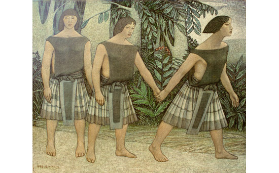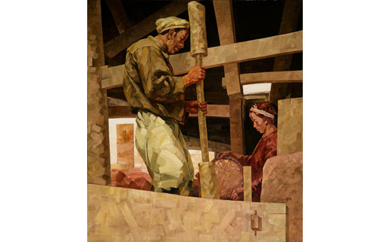 谢麟在对广西地域和诸少数民族的油画表达中显示了他的敏锐、深刻和独到。用油画处理我国少数民族题材,成绩成就最突出的应该是新疆诸民族题材的油画创作,然后是青藏西藏和高原题材、蒙古族和草原题材、云贵风情题材等等。广西和瑶族题材能在油画艺术中达到当代油画史中不可或缺的地位,是由谢麟的油画创作作为标志的。谢麟的这类题材创作主要表现为他的白裤瑶题材的系列作品。他的白裤瑶题材入画是基于长期深入此一民族及村寨之中,反复咀嚼民族生活的文化内涵,对民族视觉和色彩深处的哲学、人类学、美学思想进行了深入钻研和参悟后再渗透到油画语言中来的。他至少使用了四种油画语言表达了他的油画的广西性和民族性。一是《正午》《纺棉花》之类的作品,笔触极其细腻,人物神态、面貌描写生动,抽绎准确,色调温暖厚朴,画面浸透深沉的悲悯与崇敬。二是《红山果》《瑶山春色》之类的作品,延续着准确的写实性,又以更为明朗的色彩,在人物和背景的写实性中加入装饰性和适度的夸张变形,形成具有时尚性的时代性和青春性,把南方少数民族题材青春化处理,使之代入到当下生活,可谓别开生面。三是《夯墙》《瑶寨》《壮族汉子》《广西壮族自治区成立》《欢乐的瑞丽》之类的作品,画风注入粗犷、写意,色彩大开大合,油彩大刀阔斧地切割刷刮,人物环境和时代氛围还原到“原生态”,增加人物的浮雕性和立体感,把主观情感深藏在客观真实的人物与场景之中。这类作品对人物与动态、动作的观察细致入微,能够准确地呈现最具典型性的民族姿态、动作、表情、性格,一看就不是浮光掠影之作,而是深思熟虑、深见功力的作品。四是《老村》系列、《南丹组画》《瑶山印象》之类的作品,色彩上只剩下黑与白,造型上走向抽象。这些作品实验和呈现的是白裤瑶人民对色彩抽象简化到黑与白二色的民俗观,是一种大道至简的哲学思想的艺术表达。所以它们既是某一个民族的色彩思想,也是一种人类的视觉哲学和结构主义。问题的关键处在于,这些作品的抽象、黑白、线面板块、色彩走势中,存在着一目了然的民族性格、风俗、物象,如《牛栏》《晾布》《土罐》《老村》。在抽象和形象之间把少数民族题材处理到如此艺术的程度,谢麟的油画是难得一见和屈指可数的一种。