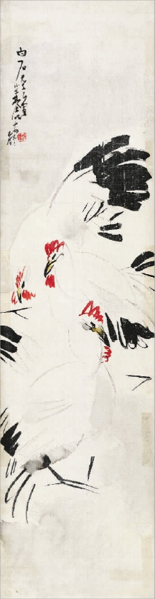 “这段往事迄今九十年整,此展在北京画院美术馆举办,无疑留给观众某种回忆与遐想。 ”北京画院美术馆副馆长、本展策展人郑智威介绍,此画上以浅淡的墨线,潇洒流畅地画出三只白羽鸡,鸡冠如红宝石般闪烁于其间;笔墨简括,清新,看得出有借鉴民间瓷绘的成分。
