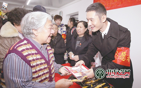 2015年11月,黄晓明在天津为老人发放黄手环