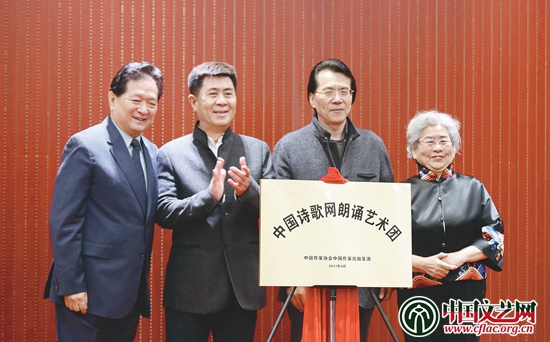 中国作家协会副主席何建明向中国诗歌网朗诵艺术团授牌,著名朗诵艺术家瞿弦和、虹云、郭凯敏等出席授牌仪式。