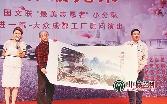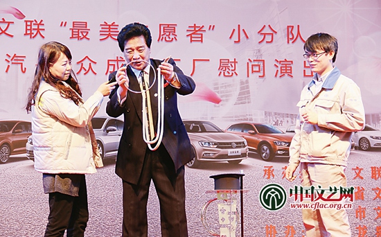3月20日下午,“最美志愿者”小分队走进一汽-大众成都工厂慰问一线劳动者。荣获全国学雷锋志愿服务“四个100”活动“最美志愿者”称号的温玉娟、黄豆豆、王书平,以及牛群、乌兰图雅、霍勇、罗秉松等艺术家,带来了歌曲、舞蹈、戏曲、朗诵、魔术等精彩表演。霍勇演唱的歌曲《咱们工人有力量》《快乐的马车夫》铿锵有力,振奋人心。舞蹈家黄豆豆在演出《吉祥袖舞》时,更是从舞台上一路“舞”到台下的水泥地板上,一举一动令人叹为观止。50岁的汽车安检工人吴璋华,被年逾七旬的魔术表演艺术家罗秉松拉上台,手把手地教她绳索穿环的魔术,“太激动了,太神奇了!居然还和魔术师一起变魔术”“这些只在春晚上见过的明星来看我们,真的是对我们汽车工人最大的肯定,很骄傲!”在座的工人观众无不兴奋激动。“金奖银奖不如老百姓的夸奖,金杯银杯不如老百姓的口碑。”牛群对此有感而发。