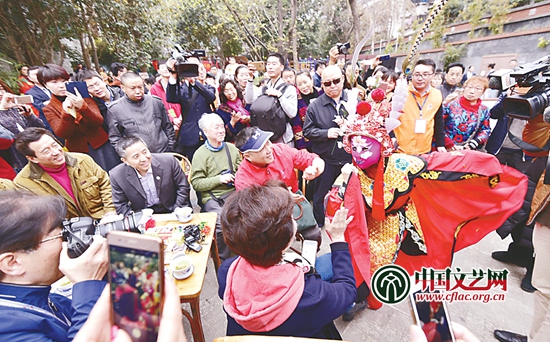 与会艺术家在成都市武侯区玉林街道黉门街社区与“变脸”艺术家面对面 李豫龙 摄