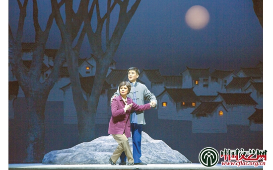 矛盾闹得正不可开交,母亲出场了,本已聋了的她不仅听到哥俩吵,甚至听到之前向农夫妻有意避开她的窃窃私语,儿媳怨责儿子不抓紧时间看病,斥责向中不该这样对待患癌症晚期的哥哥。向农大惊,责备妻子说话不小心,向中则痛骂自己不懂事,撇开往事,决心砸锅卖铁也要送哥哥去医院。这中间有一段向母踉跄奔出、激情演唱西皮导板转原板的老旦唱腔,历数向农多年来为村民作了多少好事难事而积劳成疾,唱出对儿子的痛惜之情。这样的唱,集中唱情,而且唱得是地方,恰当利用了传统的行当和京剧唱腔板式与调性的程式。戏只进到第三场,便造成全剧起承转合的第一次高潮,掀起感情的风暴,催人泪下,邀人激赏。