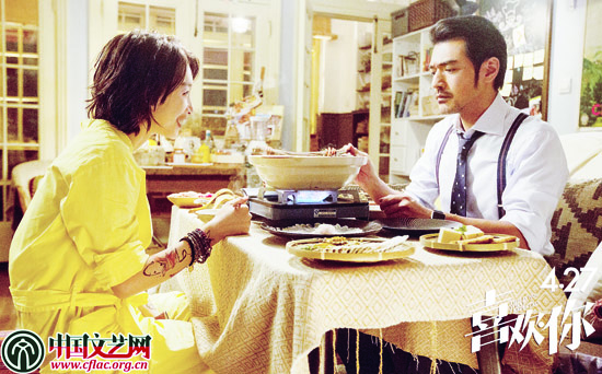 从爱情主题的设定上看,《喜欢·你》沿用了“神经喜剧”中惯常的“欢喜冤家”模式——行为古怪、性格乖僻、有着阶级鸿沟的男女主人公从最初的敌对走向最终的牵手。影片中,延续了“霸道总裁”人设里“挑剔、毛病多、要求高、性格孤僻”等种种特点的路晋(金城武饰),与自由不羁的天才少女厨师顾胜男(周冬雨饰)“以菜会友、隔空交手”,萌生了由舌尖到心尖的共鸣。正如本片的英文名“This Is Not What I Expected(这不是我所想象的)”所表达的一样,这两个似乎毫不搭调的人物,从初遇时相互厌恶,到因美食而产生联结,最后吃出爱情、怼出甜蜜,呈现出一种“意料之外”的反差萌。