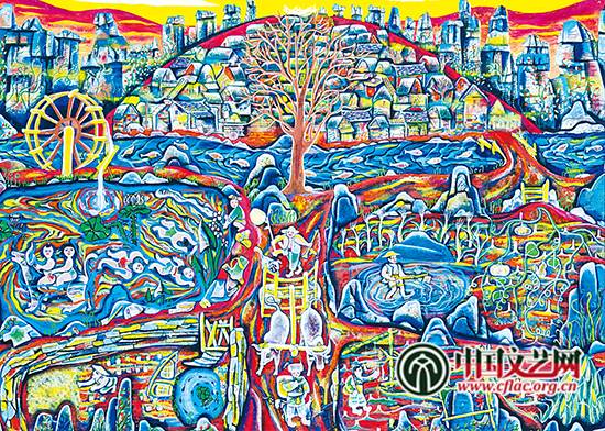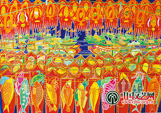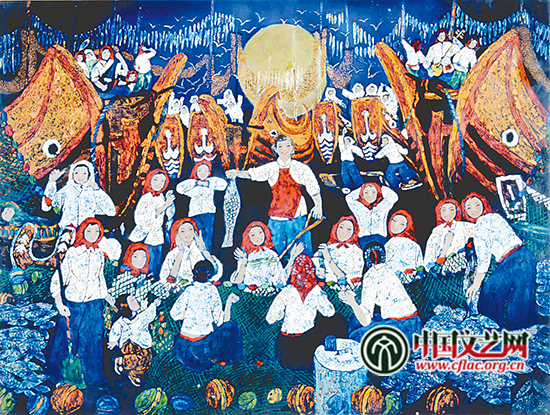 在国家社科重大课题“城镇化进程中民族传统工艺美术现状及发展研究”课题组为期三年的农民画调研中,我们走访了全国20多个画乡,运用人类学的方法深入研究当代农民画作者的生活、创作状态,深刻体会到农民画是诠释传统民间审美、民间艺术思想的抓手,是民众最原始、淳朴审美趣味的体现。我国56个民族的多元文化发展,山地、平原、海洋各种地貌的影响,使农民画呈现出丰富多样的精神面貌。浙江舟山的打鱼生活,形成了海洋符号的视觉语言,作者们描绘生活中的场景和盼家人打鱼归来的期待之情。杨素亚的作品《东海》,体现了海上劳作的生活。杨素亚经历过大病,对生命有着独特的感悟,在绘画作品中可以看出丰富的情感表达和对生活的热爱。四川甘孜州乡城县作者着着,每天带领着徒弟们绘画寺庙的壁画,为本次展览创作了《南丝路一带缘,藏汉人一家亲》,作品汲取唐卡艺术的手法,再现了四川南丝路一带藏汉经济贸易和文化交流的场景,突出一带一路、藏汉一家亲的主题。杭州作者刘巧云,以女性的微观视野描绘着心中的家园,她常常从一棵树、一片树叶、一只昆虫等细微之处寻找灵感,这次入选的作品《放大镜下的蟋蟀》描绘了一个孩子视野下的自然世界,传达出细腻敏捷的情感体验。在调研浙江余东农民画的时候,虽然村子里生活条件并不富裕,但是余统德、郑利民、吕卸良、金光炎等农民画作者围坐一起,互相打趣的场景令人不能遗忘,越是辛劳,越是热爱。腾冲农民画作者跨过中缅边境赶来采访的场景,欢畅的歌声和傈僳汉子的笑脸久久浮现在眼前,难以忘怀。这些农民画作者鲜活的民间生活滋养了其作品的特殊精神面貌。还有一些农民画作者,身体有残疾,但是仍然以乐观的态度通过绘画表达自己的心声,传递乐观向上的精神面貌。