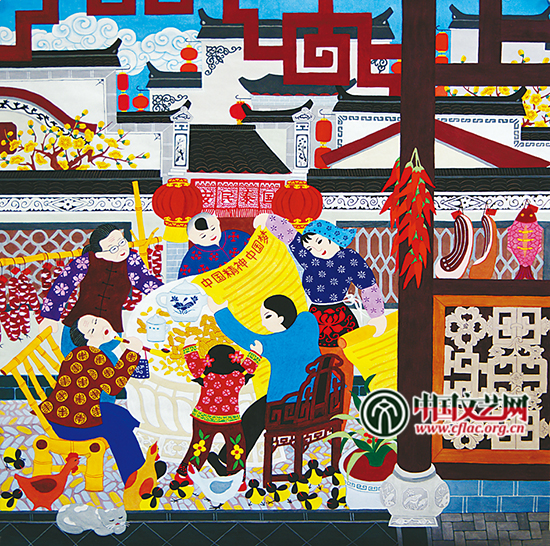 看到伟大的祖国正昂首阔步地前进,让我心潮澎湃,热血沸腾。我想用我的画笔,来倾注我的满腔热情。当我接到“中国精神·中国梦”的创作任务时,心中是有些焦虑的,因为可画的题材太多了:山川新貌、和谐社会新气象、助人为乐新风尚、古朴民俗民风……我是安徽人,对安徽的民俗民风有较为深入的了解。于是我以古朴典雅的安徽民居为背景,以安徽老乡淳朴勤劳的品德为主线,表现他们在春节即将到来之际,家家户户杀猪杀鸡、做豆腐、做米粑、贴春联、挂灯笼、搞卫生的欢乐祥和景象。画面上有整洁的乡间小道,洁白的粉墙上,晾晒着火腿、咸肉、香肠,尽管听不见他们的欢声笑语,然而在他们的形态上便一目了然他们的满足和喜悦。