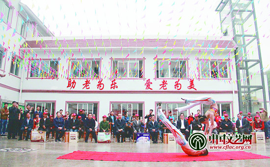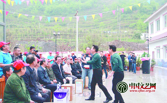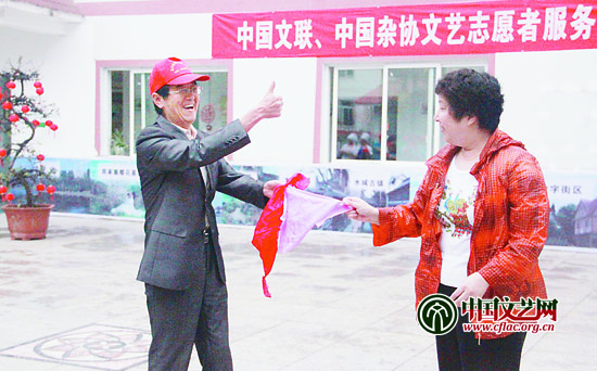 王仁刚(右)代表文艺志愿服务团向敬老院赠送棉被