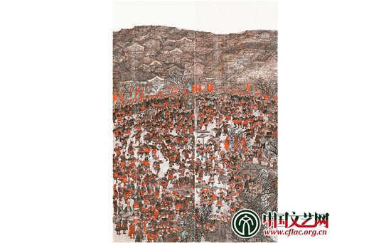 祖国壮美的山水和丰富的人文历史为画家提供了丰厚的创作土壤。2008年广州美术学院中国画系山水专业研究生毕业的陈勇,师从林丰俗教授,《故园暮韵》是他2015年以太湖石为主体、苏州园林为背景创作的一幅中国画作品。太湖石的漏、瘦、透与苏州园林的灵、秀、美,在他笔下是那样融洽,楼亭的苍韵与湖水的波光,还有人头攒动的游客,又是那样灵动,中国山水在他笔下是那样俊俏,这幅作品入选广东省第13届美术书法摄影作品联展。陈勇不仅擅长山水画创作,对各种反映人文历史的中国画也进行了积极的探索,2016年他创作的《瑶族·盘王节》就是他探索的成果之一。盘王节是瑶族祭祀祖先盘古、盘庚、盘瓠的重大节日,历史悠久,每年的农历十月十六,参加祭祀的男女老少都要穿上自己民族的节日盛装,聚集在一起唱歌、跳舞。这是一场增强民族向心力、维系民族团结的人文盛典,已被列入第一批国家级非物质文化遗产名录。陈勇为瑶族文化所感动,多次深入瑶乡采风挖掘素材,用四个月时间完成了这幅作品。作品以红、白、黑为主色调,以众多瑶族群众为主角,通过他们的表情动作传递了他们内心的欢欣与雀跃。作品场面宏大,人物表情、动作丰富,不仅反映了瑶族的人文历史,更反映了中国人逢盛世的精神风貌。该作品入选“同心筑梦”第二届中国民族美术双年展。