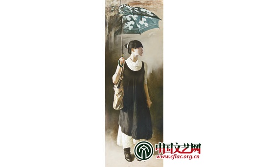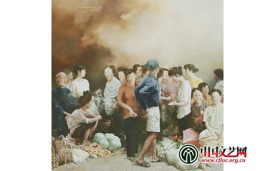 “胜日寻芳泗水滨,无边光景一时新。”品读“风度九俊”的作品,新的气息、新的气象、新的气韵扑面而来,真可谓让人耳目一新。《暮雨》是“九俊”老大哥邓伟华的作品,画作中,一个妙龄少女手持花布雨伞,伫立雨中深情远望。白嫩的肌肤、修长的黑白连衣裙、时髦的花布雨伞、磅礴的大雨构成了简约的画面语言,而姑娘坚定的眼神和肩上挎着的空空行囊,却引起了人们无限的遐思:磅礴的大雨下她在望什么?她在想什么?她肩上的行囊为何空空?这种特定环境下的遐思,勾起了人们探究的欲望。邓伟华说:“这幅作品取北宋词人晏几道‘落花人独立,微雨燕双飞’的意境,目的是要反映我国改革开放过程中人们的思考。”从困境中走来的脚步、放下包袱后的轻装、坚定凝望的眼神真实反映了当时人们的精神面貌,这是《暮雨》获得广东省第三届当代油画艺术展学术奖的重要原因。他同一时期的作品《集市》,以改革开放30年我国农村集市的一个断面为背景,记录了这一时期人们物质生活逐渐丰富、市场经济意识逐渐增强的现实。画面中人物脸谱的模糊化设计,使生活真实与艺术真实得到了充分演绎;而画面背景的乌云构造,则预示了市场经济的风云变幻,作品获得了纪念改革开放30周年广东省美术作品展优秀奖。