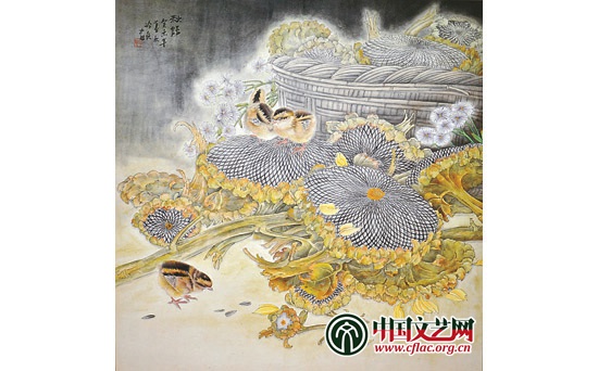 家乡是画家笔下永恒的题材。女画家冷爽原籍吉林省,对家乡的眷恋常常体现在她的画作中。《清风吹破水上天》《秋语》都取材于她的家乡。前者以荷塘、荷叶、荷花、水鸭等元素入画,灰黄色的荷叶衬托了荷花的高雅与洁白,大量留白的荷塘与水鸭的戏水,使画面有了“吹破水上天”的空灵感与灵动感,凸显了画作的艺术张力。后者以雏鸡、向日葵为主题作画,向日葵花瓣的暖色调与雏鸡雀跃觅食的情形相映成趣,反映了秋日农家丰收的喜悦场景,给人暖暖的希冀。这不禁让人想起陆游的诗句:“莫笑农家腊酒浑,丰年留客足鸡豚。”该作品2009年入选中国少儿美术教师展。