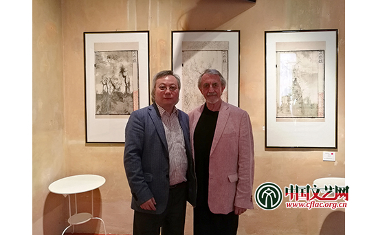 傅文俊和博物馆馆长何塞•曼努埃尔•因菲斯塔在作品《昨夜西风》前合影