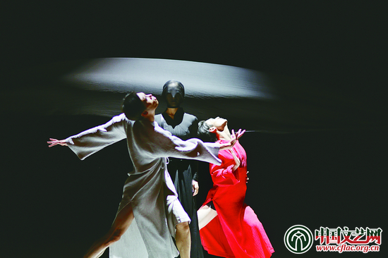 “一幅画卷,一件红袍。一个在天,一个在地。我的生命从这里开始。”舞剧在此拉开序幕。面对唐寅这位诗画家,我们绝不会也绝不应该选择以写实手法来完成这部舞剧。当我们沉浸在他那些充满着想象力的诗文和他梦见九鲤仙子赠其宝墨万锭的传奇故事时,“墨”跳入了我们的视线。墨是中国古代书写和绘画用到的墨锭。自从唐寅梦见墨锭后无论是写诗、做文章还是绘画都下笔如神。为了纪念这个梦,他在桃花庵中建造了“梦墨亭”。但是,在我们看来墨的世界并不简单:“墨”是宝,让唐寅才华横溢;“墨”是刑,他因才华过人而蒙受诬陷入狱;“墨”是死亡,带着他心爱的人远去。在舞剧中将充分利用“墨”拟人的方式,在唐寅人生不同的阶段呈现出截然不同的寓意。