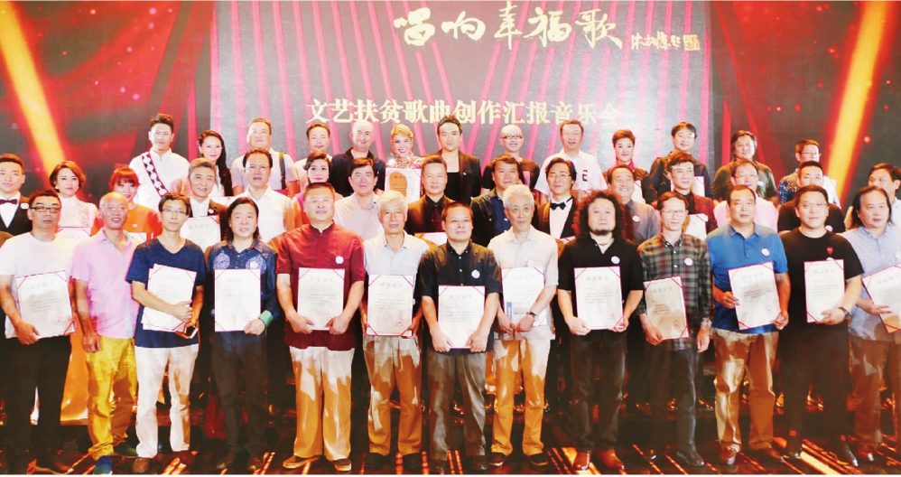 为迎接党的十九大胜利召开,展示新时期文艺家坚持以人民为中心的创作导向,深入生活、扎根人民,繁荣发展社会主义文艺的新成果,通过宣传推广创作歌曲促进贫困县脱贫攻坚,中国文联、中国音协、中国文艺志愿者协会于9月8日在京举办“喜迎十九大唱响幸福歌”文艺扶贫歌曲创作汇报音乐会,其中的音乐作品是近期中国文联文艺志愿服务中心、中国音协共同邀请一批知名词曲作家为“文艺扶贫奔小康”志愿服务行动工作示范县专门创作的形象歌曲和近年来在“送欢乐下基层”文艺志愿服务活动中为贫困县创作的歌曲。