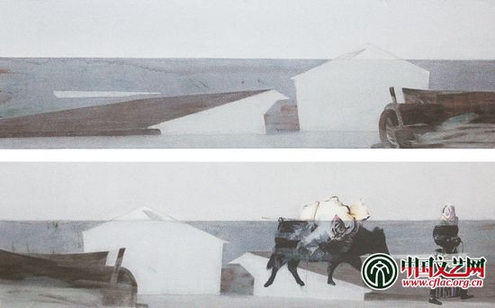 宋光智的石版画中的人物与景物从现实场景的描写中剥离出来,使画面显得形愈简而意愈丰。