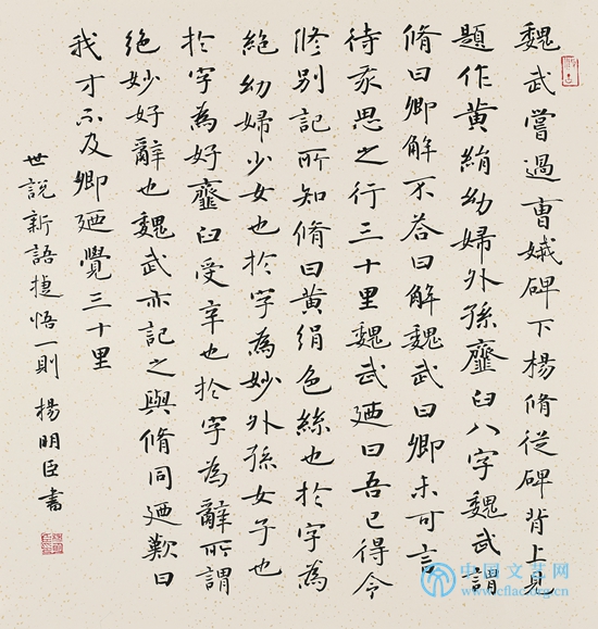 在对时代特点和字体特殊性有如此清晰认识的前提下,杨明臣仍然选择小楷作为主攻方向,显示了巨大的勇气和坚卓的毅力。能够从千军万马中走出自己的道路,成为当下小楷书法的代表性人物之一,他的付出是可想而知的。他在《小楷的格调》中写道:“往往需要积十年、数十年之功才能稍显个人面貌。”这句话与其说是在劝告读者不可“妄取捷径”,不如说是他的自况。若无超越常人的艰苦磨砺,他作品中那得古法之妙而又融入我意、我法、我情、我趣的高超技术,是断断不可能实现的。