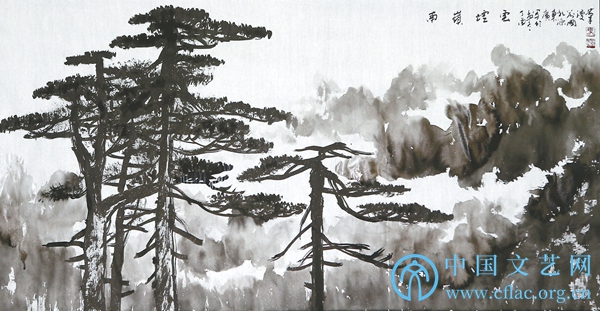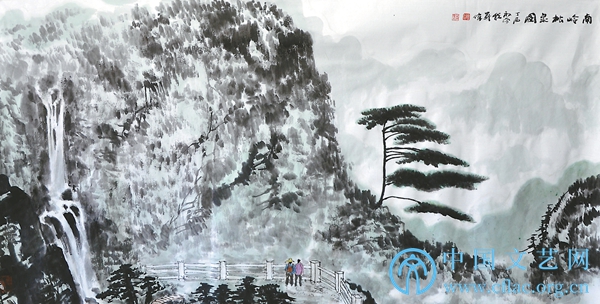 比之云门山的秀逸、飘渺,南岭奇俊、放达。山上多水,瀑布群随处可见。在“九重山”观景台,见南岭云海;在“小黄山”,见秀色可餐的迎客松。画家对景物敏感,这棵迎客松即刻牢记,成了他们画画的题材。晚上笔会,画家合作的画作上,这棵迎客松就站在宣纸上了。我站在画作前,看着画家笔下的迎客松,回忆上午时分在“小黄山”看到的迎客松,对比着彼此的不同。站立在南岭的迎客松,迎风沐雨,生机勃勃,笑迎南来北往的友朋。而站在宣纸上的迎客松,有了心思,有了情感,有了回忆,有了忧愁。两棵迎客松,是一棵树,却有了两棵树的风度。