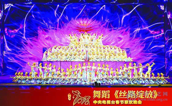 俗话说,“上有千条线,下有一根针”。平素里,这未必是一个有意义的表达,但在2018央视春晚舞蹈这里,分明成了一个有意义的事情!这里的一根针,就是咬定青山不放松的舞蹈艺术旨趣,是精益求精的艺术表现上的求索,是兢兢业业的制作精良。集中体现在两个独立的舞目《丝路绽放》和《亮花鞋》上。需要指出的是,两个作品的表现方式有异曲同工之处,都是靠构图的巧妙运化取胜,都是用形式感的诱人效果抓人,都是靠排练的精湛与群体的完整性、律动的本体张力和身体文化性的多姿多彩凸显艺术魅力。所不同的是,前者的历史文化气质浓厚,后者的民俗文化信念淳厚。但无论怎样,二者对中华传统文明的当代阐发始终不渝,构成其不变的追求,主题的突出、性格的鲜明、表达的明晰和韵味的深远悠长不一而足。从局部到整体、从细节到完型都显现出高规格的艺术气象、高品质的艺术境界,充分体现了春晚舞蹈的艺术品质。