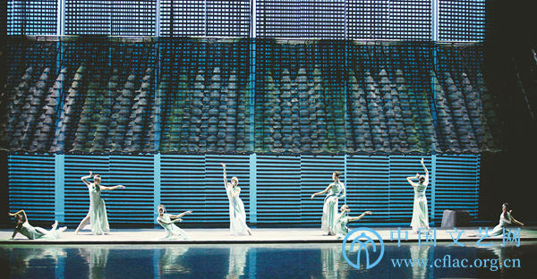 看来,舞蹈诗《节气江南》就是要带着我们这样由“夏”入“秋”了,说到江南,人们都爱说“春来江水绿如蓝”“烟花三月下扬州”;但其实唐代诗人杜牧眼中的扬州之美,更是“青山隐隐水迢迢,秋尽江南草未凋。二十四桥明月夜,玉人何处教吹箫?”看舞蹈诗《节气江南》,那个有“玉人吹箫”之意境的女群舞是“放河灯”。盛夏的繁星闪烁,至仲秋已是星疏夜朗了,编导选择“放河灯”来开启“秋之节气”,仿佛把“迢迢银河”迁徙到人间;如此,那些“放河灯”的少女就宛如穿行在天河中的天仙了——舞蹈中,画外音出现昆曲韵白的秦观词《鹊桥仙》,道是“柔情似水,佳期如梦,忍顾鹊桥归路。两情若是久长时,又岂在朝朝暮暮”。这时你就会深深地感受到,舞蹈诗《节气江南》耐看耐品,是因对“节气”的表现不仅“意象”生动,而且“情思”深远——“放河灯”放的是“秋”的意象,但内里却寄寓着“春”的情思。
