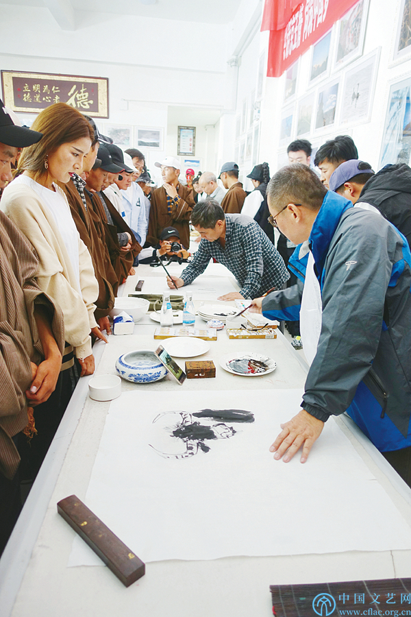 除了精彩的文艺演出,活动期间,韩振刚、张建豹、曹佳林、杨文乾4位美术家、书法家与玉树当地书画家一起进行了3场创作笔会,为当地人民送上《锐气东来》《书到千秋》《京郊春韵》等多幅书画作品。在创作的同时,首都书画家还进行了书画支教和现场教学,解答当地书画爱好者和学生的问题,为他们演示具体的书画技法,向他们讲解北京传统书画的悠久历史与独特魅力。书画家们在现场挥毫泼墨,用一幅幅作品表现了首都书画家对玉树美丽风光的热爱,表达了对玉树脱离贫困获得繁荣发展的深情寄望,更是送上“京玉一家亲”的美好祝福。
