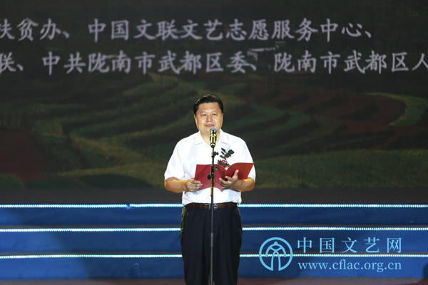 在中国文学艺术界联合会对口帮扶武都二十周年之际,7月18日,中国文学艺术界联合会、中共甘肃省委宣传部、中国文艺志愿者协会、中共陇南市委、陇南市人民政府主办的“武都椒红 筑梦小康”中国文联文艺志愿服务团走进甘肃陇南武都区慰问演出在甘肃省陇南市体育馆举行。图为中共陇南市委副书记刘永升致欢迎辞。中国文艺网 白伟 摄