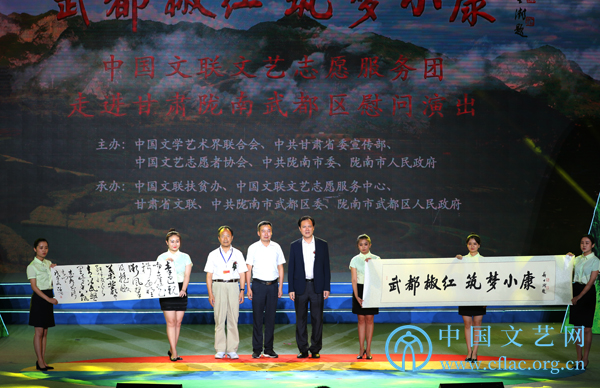 在中国文学艺术界联合会对口帮扶武都二十周年之际,7月18日,中国文学艺术界联合会、中共甘肃省委宣传部、中国文艺志愿者协会、中共陇南市委、陇南市人民政府主办的“武都椒红 筑梦小康”中国文联文艺志愿服务团走进甘肃陇南武都区慰问演出在甘肃省陇南市体育馆举行。图为中国文联党组成员、副主席李前光向武都区赠送由中国书法家协会主席苏士澍题写的“武都椒红 筑梦小康”书法作品和国家行政学院博士生导师、第六届中国书法家协会理事、中央国家机关书法家协会副主席周文彰的书法作品。中国文艺网 白伟 摄
