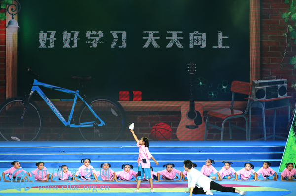 西南科技大学文艺支教志愿者、武都区吉石坝小学学生共同表演情景舞蹈《大山课堂》。中国文艺网 白伟 摄