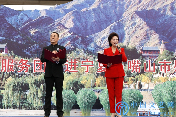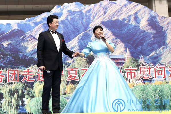 为庆祝宁夏回族自治区成立60周年,8月7日至10日,中国文联文艺志愿服务团赴宁夏多地开展文艺志愿服务活动。8月8日,由中国文联、宁夏回族自治区党委宣传部、中国文艺志愿者协会主办的“中国梦·宁夏情”庆祝宁夏回族自治区成立60周年——中国文联文艺志愿服务团走进石嘴山市慰问演出在石嘴山市行政中心广场举办。图为温玉娟、杨树泉朗诵《石嘴山礼赞》。中国文艺网 周春桃 摄