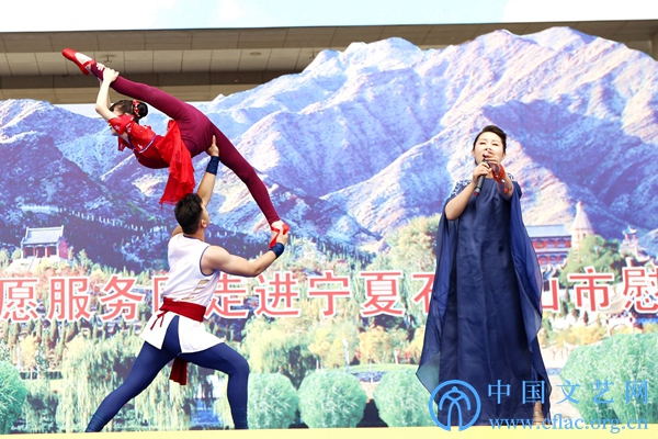 为庆祝宁夏回族自治区成立60周年,8月7日至10日,中国文联文艺志愿服务团赴宁夏多地开展文艺志愿服务活动。8月8日,由中国文联、宁夏回族自治区党委宣传部、中国文艺志愿者协会主办的“中国梦·宁夏情”庆祝宁夏回族自治区成立60周年——中国文联文艺志愿服务团走进石嘴山市慰问演出在石嘴山市行政中心广场举办。图为李雨儿、李梦楠、龙云侠表演歌舞杂技《九儿》。中国文艺网 周春桃 摄