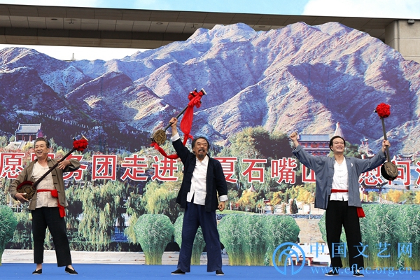 为庆祝宁夏回族自治区成立60周年,8月7日至10日,中国文联文艺志愿服务团赴宁夏多地开展文艺志愿服务活动。8月8日,由中国文联、宁夏回族自治区党委宣传部、中国文艺志愿者协会主办的“中国梦·宁夏情”庆祝宁夏回族自治区成立60周年——中国文联文艺志愿服务团走进石嘴山市慰问演出在石嘴山市行政中心广场举办。图为尚铁龙、徐明智、徐晨表演宁夏坐唱《喜鹊唱红了贺兰山》。中国文艺网 周春桃 摄