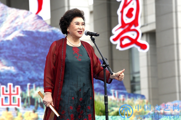 为庆祝宁夏回族自治区成立60周年,8月7日至10日,中国文联文艺志愿服务团赴宁夏多地开展文艺志愿服务活动。8月8日,由中国文联、宁夏回族自治区党委宣传部、中国文艺志愿者协会主办的“中国梦·宁夏情”庆祝宁夏回族自治区成立60周年——中国文联文艺志愿服务团走进石嘴山市慰问演出在石嘴山市行政中心广场举办。图为殷秀梅、王泽南领唱《共筑中国梦》大合唱。中国文艺网 周春桃 摄