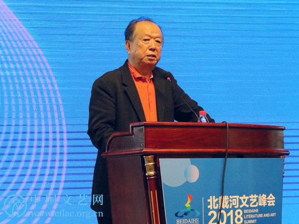 9月11日,“北戴河文艺峰会”在北戴河开幕。图为仲呈祥在开幕式上做题为《面对新时代的当代影视剧创作》的发言。中国文艺网 韩雪竹 摄