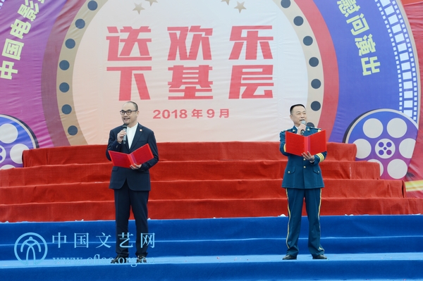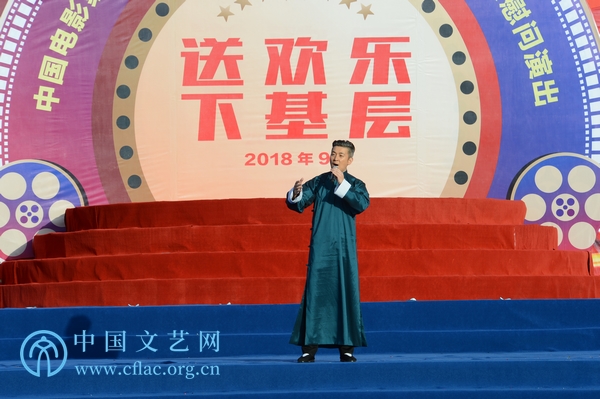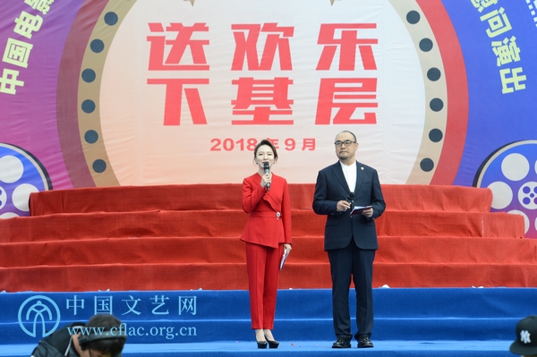 9月27日,“送欢乐·下基层”中国电影家协会文艺志愿服务团走进陕西清涧县慰问演出成功举办。图为冀星、臧金生主持演出。