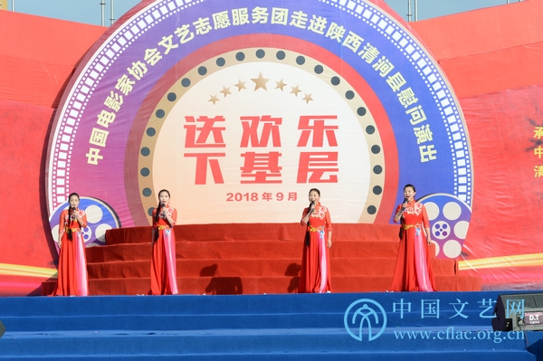 9月27日,“送欢乐·下基层”中国电影家协会文艺志愿服务团走进陕西清涧县慰问演出成功举办。图为张贞艳、秦伟、贺云霞、白巧琴演唱歌曲《二女子游花园》。