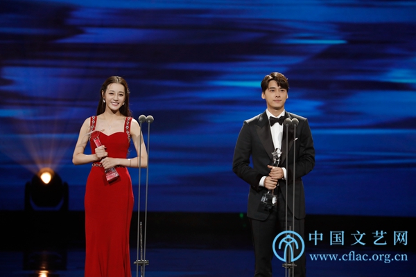 10月14日晚,第12届中国金鹰电视艺术节、第29届中国电视金鹰奖颁奖晚会在湖南长沙举行。图为李易峰、迪丽热巴分别获本届金鹰节最具人气男、女演员奖。