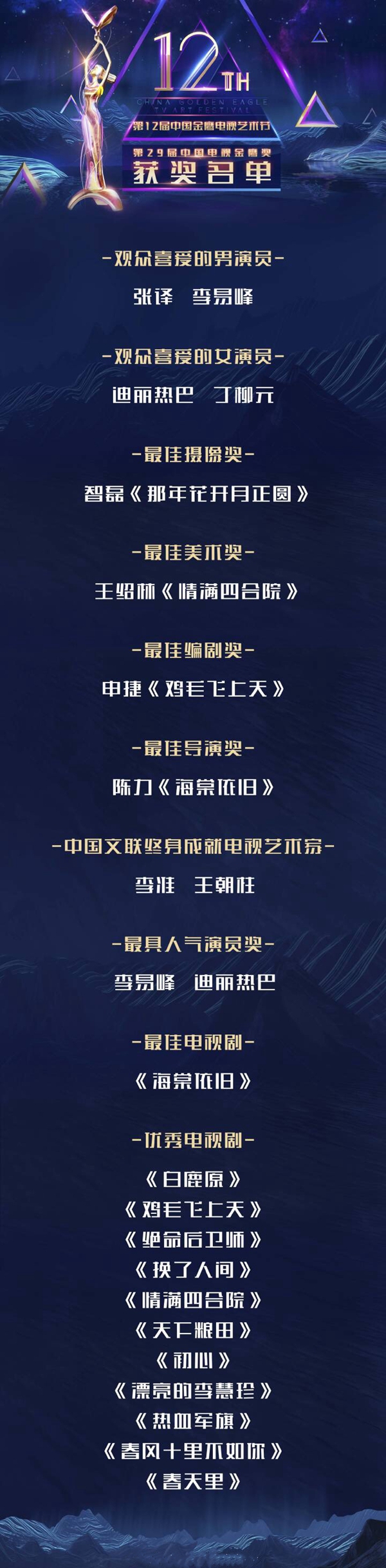 本届中国电视金鹰奖以习近平新时代中国特色社会主义思想为指导,全面贯彻党的十九大精神和党的文艺方针,旨在更好地发挥评奖在加强电视文艺队伍建设,推动创作更多无愧于时代的优秀电视文艺作品。特别值得一提的是,“中国文联终身成就电视艺术家”荣誉称号首次在金鹰节颁发,著名文艺评论家李准和剧作家王朝柱获此殊荣。《海棠依旧》获最佳电视剧奖,《白鹿原》《鸡毛飞上天》《绝命后卫师》《换了人间》《情满四合院》《天下粮田》《初心》《漂亮的李慧珍》《热血军旗》《春风十里不如你》《春天里》获得优秀电视剧奖;张译、李易峰、迪丽热巴、丁柳元分获观众喜爱的男、女演员奖;申捷凭借电视剧《鸡毛飞上天》获最佳编剧奖,陈力执导《海棠依旧》获最佳导演奖,智磊凭借《那年花开月正圆》获最佳摄像奖,王绍林凭借《情满四合院》获最佳美术奖,李易峰、迪丽热巴分别获本届金鹰节最具人气男、女演员奖。