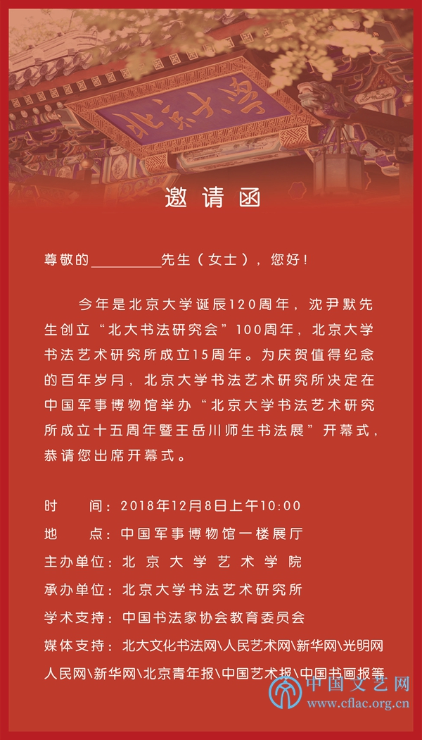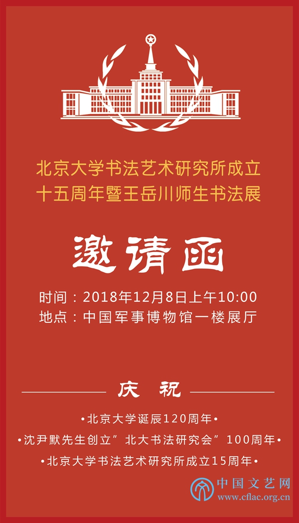 为庆祝北京大学建校120周年,北京大学书法研究会成立100周年,北京大学书法艺术研究所成立15周年,由北京大学艺术学院主办,北京大学书法艺术研究所承办,中国书法家协会教育委员会作为学术支持单位的“北京大学书法所成立15周年暨王岳川师生书法展”,将于2018年12月8日上午10:00在中国军事博物馆举行。展览将展出北大书法所所长王岳川教授书法作品及访问学者、研究生和精英班学员约60人书法作品共计70件。