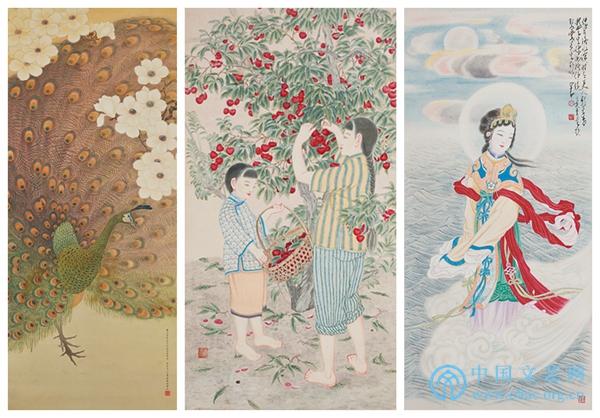 郑锦作品图(从左至右):玉兰孔雀(绢本)、采荔(纸本设色)、洛神(纸本设色)