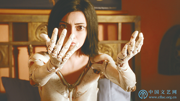 当然,以“卡神”之老练,他不可能不知道这种通过降低接受层次的再度创作将对影片内涵产生伤害,唯一的可能性就是这种老调重弹的价值观念表达是值得用任何代价来换取的。在近些年许多好莱坞科幻电影中,虽然也曾经对科技进步带来的危机进行过有限思考(如《机械公敌》《鹰眼》等),但是片中的科技威胁往往依靠主人公们在亲情、博爱、信任等价值观念的指引下展开协作就可以毫无悬念地解除。在这些影片中,高度发达的科技并不是不假思索的原罪,它们往往只是被别有用心之人或者错误的发展方向所利用,而“人性”的光辉最终将战胜一切威胁。这部影片里,阿丽塔通过“机动球”比赛获得前往天空之城的资格,关乎其为男友雨果复仇的动机,而原作中以比赛来对自我身份执著探询的目的则在影片中被完全无视了——影片中的她对其他选手痛下杀手只能被解释为其机甲身躯的战斗本能以及爱情。我们不难由此联想到美国曾经通过科技赢得冷战、获得全球霸权的历史,这种冷战思维至今未能破除。因此,好莱坞电影的意识形态不允许对科技发展进行质疑与反思,而且这种思维定势愈来愈僵化。影片中人们谈到高端的“火联科技”时那一脸狂妄、骄傲与憧憬的表情,就是明证。