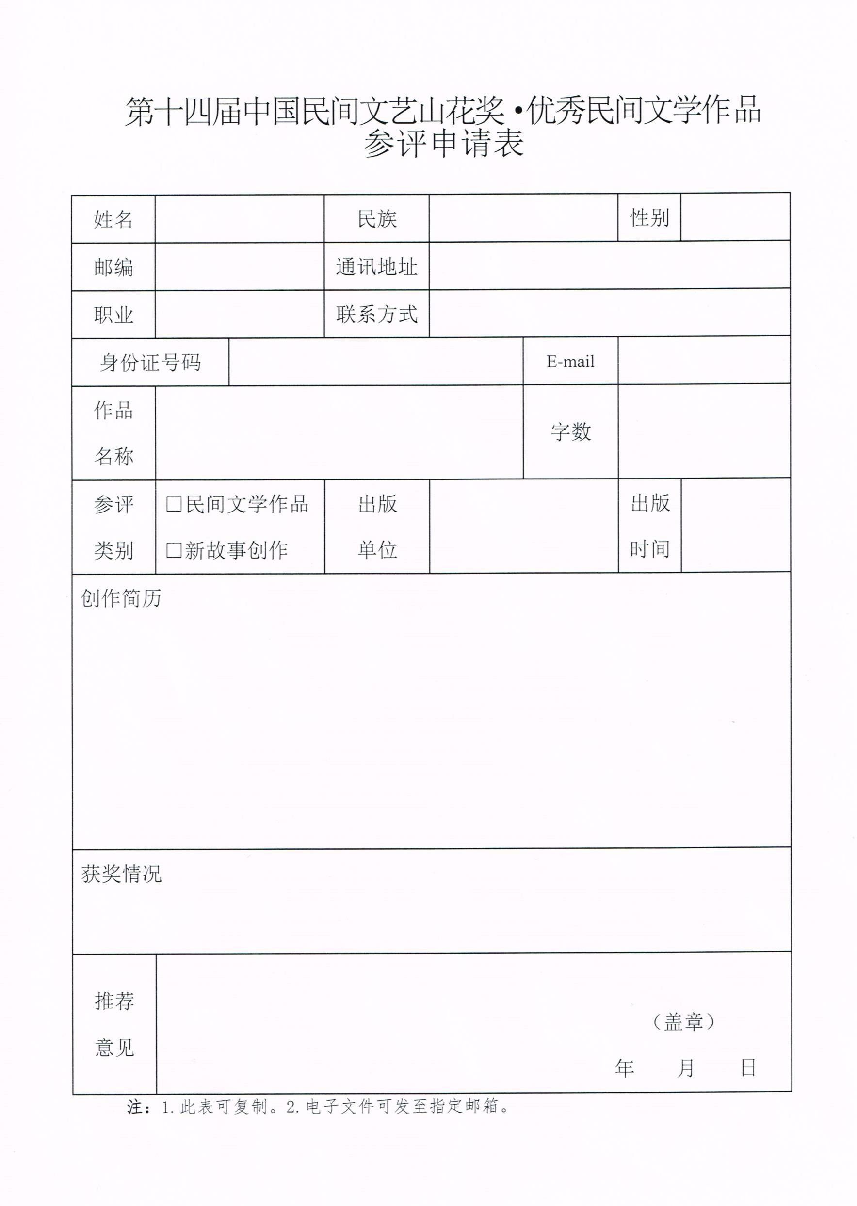 3.参评人员须填写《第十四届中国民间文艺山花奖·优秀民间文学作品参评申请表》,此表须填写省级民协或出版单位的推荐意见并加盖公章。同时,附作者身份证(正背面)复印件。