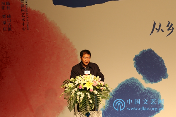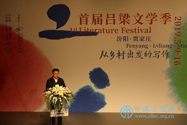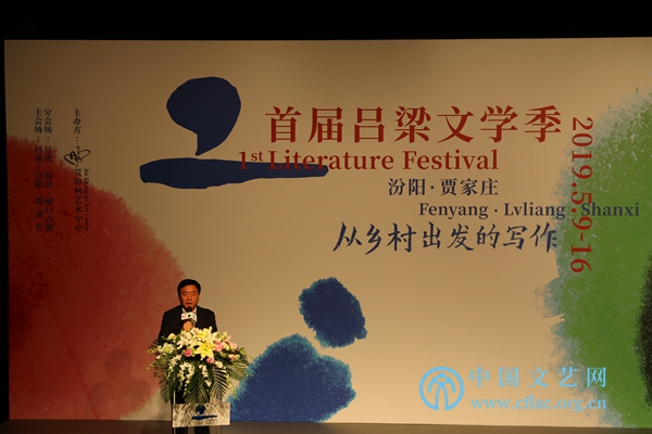 4月8日,由贾樟柯艺术中心主办的吕梁文学季新闻发布会在京举行。图为中共吕梁市委常委、宣传部部长任忠在会上致辞。中国文艺网 胡艳琳摄