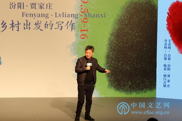 4月8日,由贾樟柯艺术中心主办的吕梁文学季新闻发布会在京举行。图为中共汾阳市委副书记、市长吴晓东在会上致辞。中国文艺网 胡艳琳摄