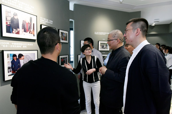 中国美术学院院长许江(左二)、策展人骆献跃(左三)、策展人卢征远(右一)在观看展览